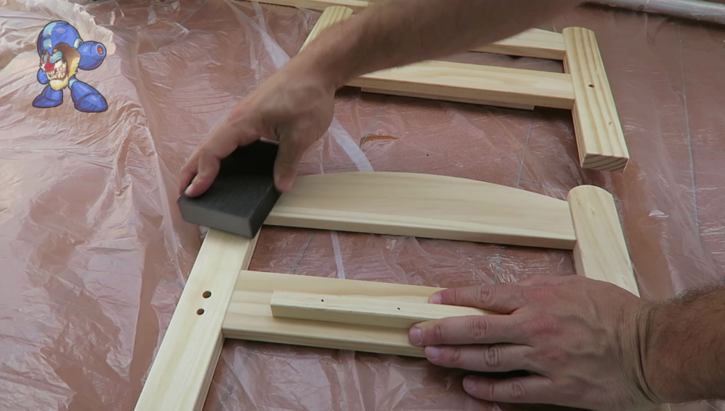 7. (7) Efecto Vintage: Para dar un efecto vintage a nuestra cama, cogeremos la misma lija fina e iremos pasándola en los cantos de la estructura y de manera aleatoria escogeremos unas zonas donde las desgastaremos más para dar mejor efecto. Recordad lijar bien la parte de las letras, para que no se vean muy perfectas.