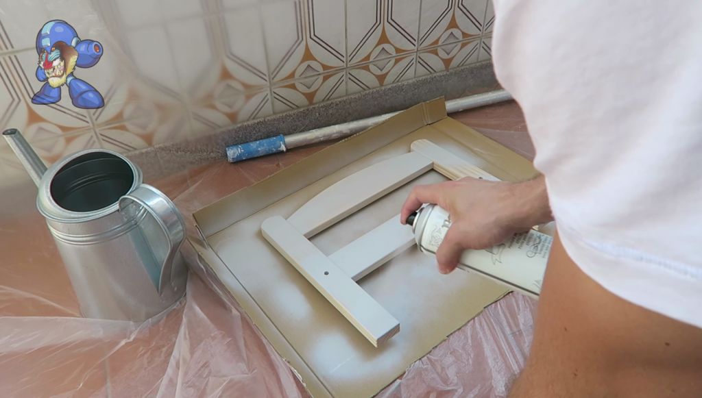 5. (5) Pintar la Estructura: Pieza a pieza, la pintaremos con el spray a una distancia de unos 25cm siguiendo la dirección de la veta. La pintura que he utilizado la recomiendo porque es de secado rápido (1h) y podréis hacer las dos caras en 2 horas. También indicar que tiene efecto tiza, así que con una capa queda muy uniforme y consistente.