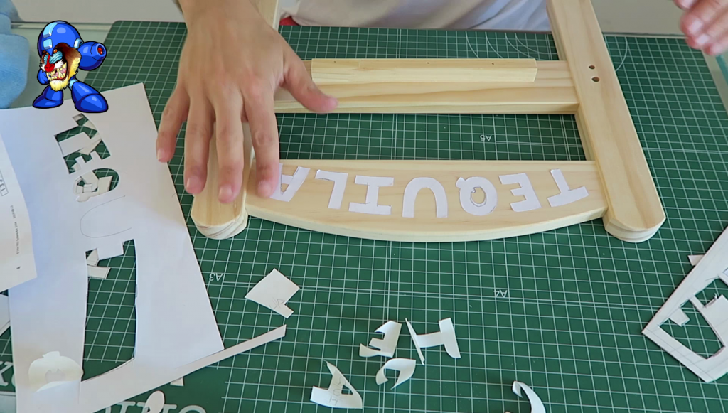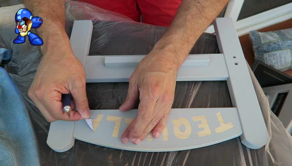 4. (4) Recortar y Pegar las Letras: Ya sea con cartones, papel de periódico o un plástico como en mi caso, es MUY RECOMENDABLE proteger la zona de trabajo de manchas debido al lijado o a la pintura.
