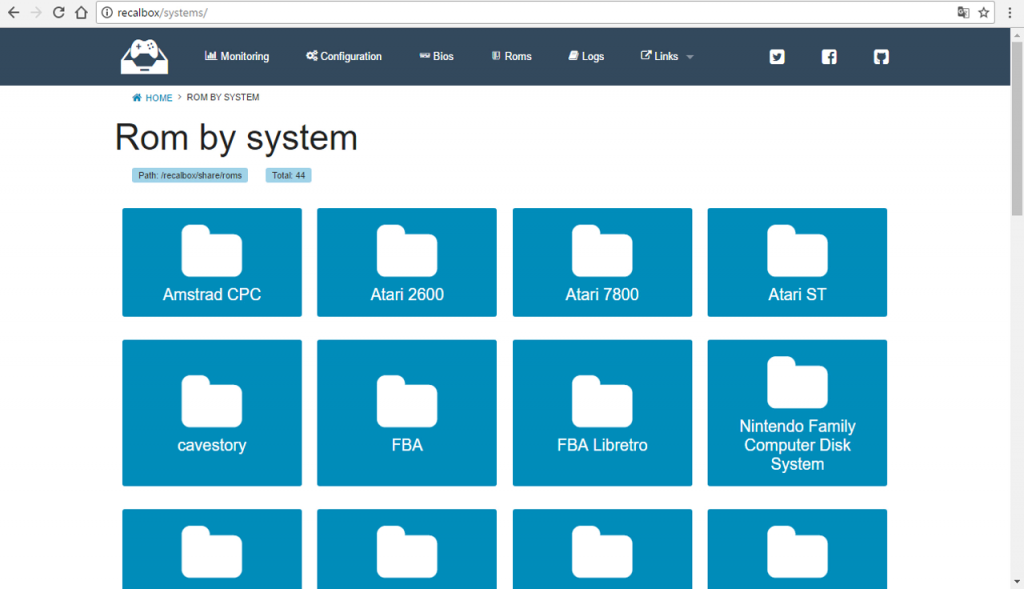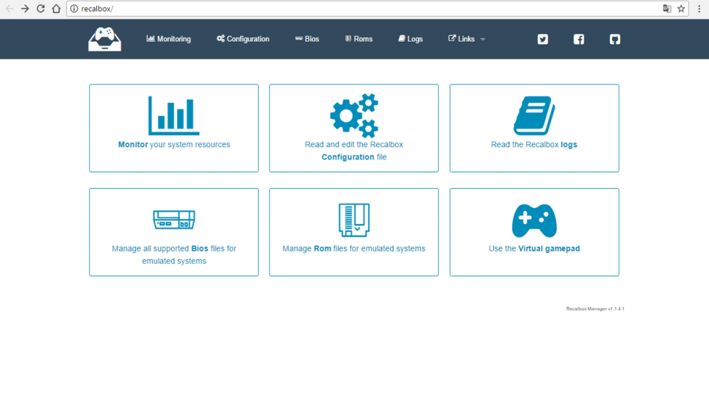 Una vez conectada, desde un PC, tablet o smartphone, podemos entrar en nuestro sistema Recalbox poniendo como URL “recalbox” y se os abrir谩 una web como esta: