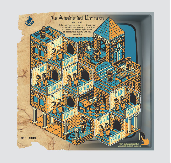 | Sello de la tercera emisión de las TIC: La Abadía del Crimen. |